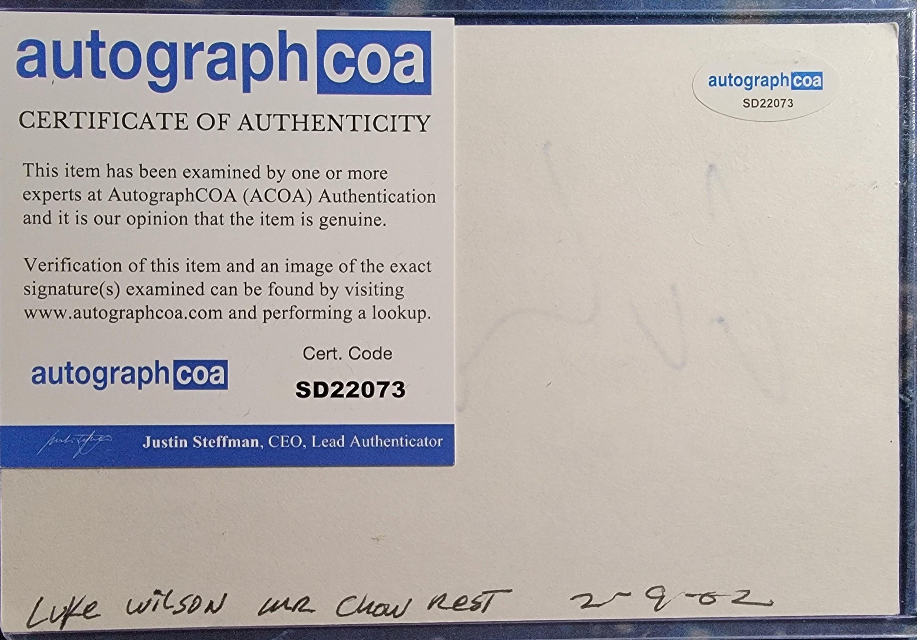 Luke Wilson Authentic Signed Index Card W/ ACOA Idiocracy